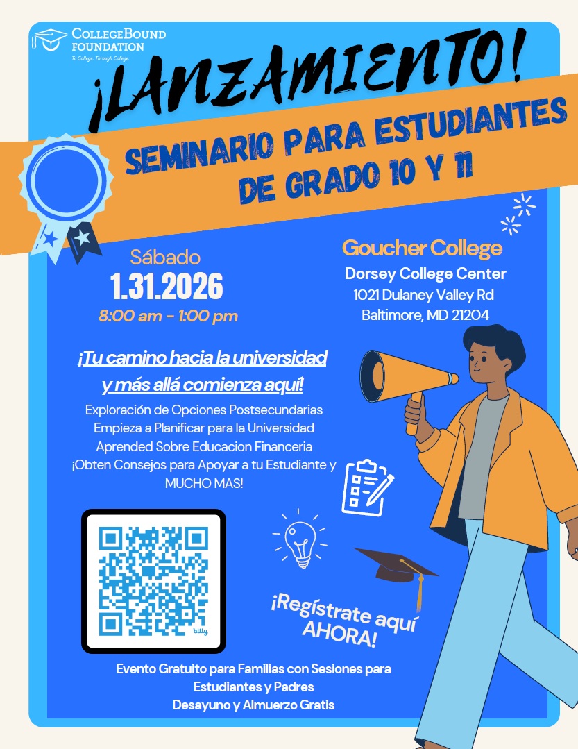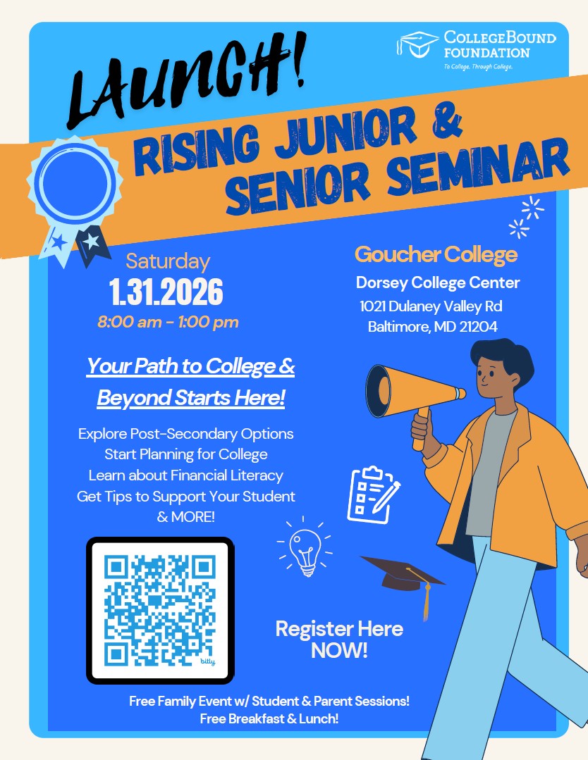 CollegeBound Foundation is a community-based organization located in Baltimore City, Maryland that has served many Baltimore City high schools/students for the last 37 years. Our annual and successful Launch! – Rising Junior & Senior Seminar targets high school students entering the 11th & 12th grades and their parents/guardians. Parents AND students are encouraged to join us for this free in-person event at Goucher College (Dorsey College Center) to gain knowledge on how to best prepare for senior and junior years of high school and how we can be of assistance to you!