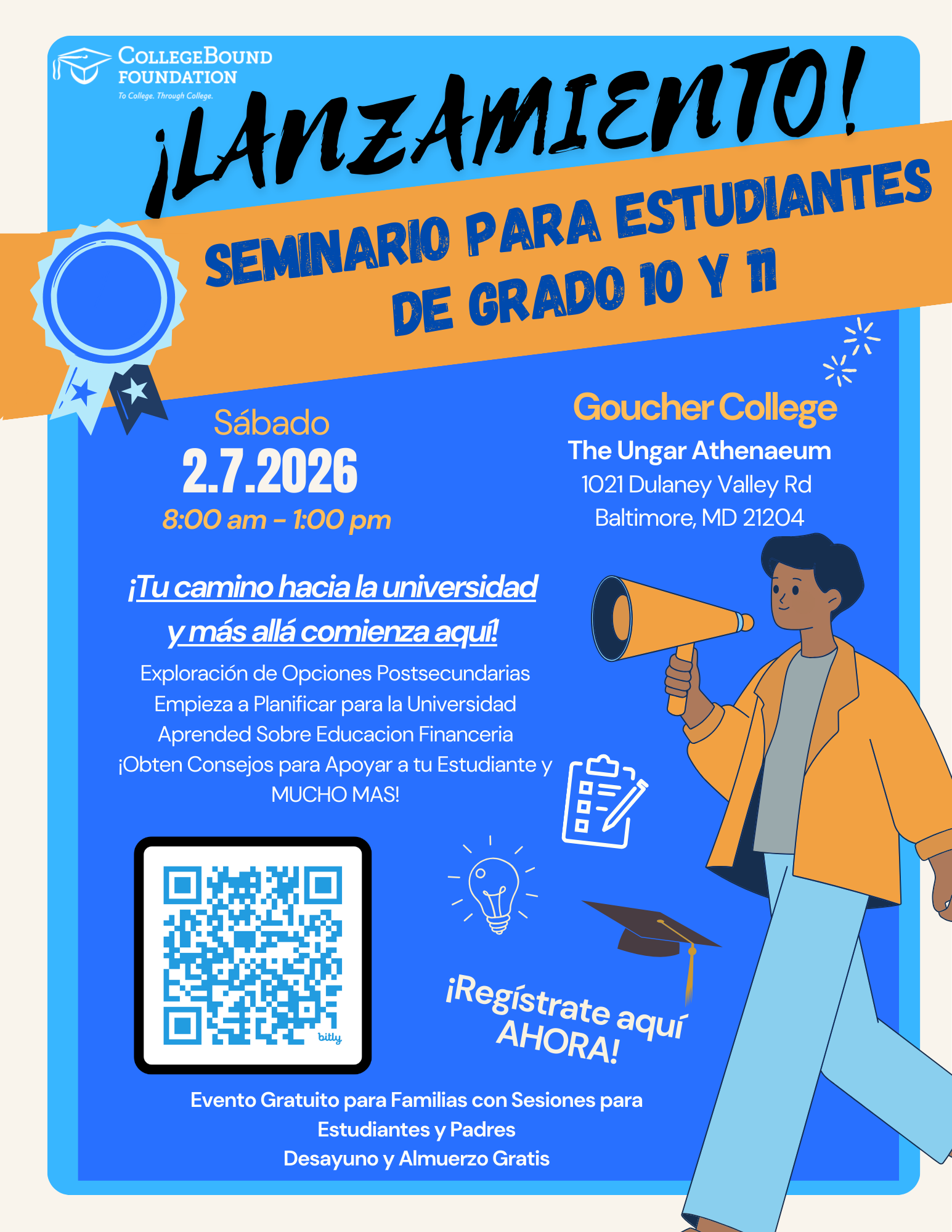 CollegeBound Foundation is a community-based organization located in Baltimore City, Maryland that has served many Baltimore City high schools/students for the last 37 years. Our annual and successful Launch! – Rising Junior & Senior Seminar targets high school students entering the 11th & 12th grades and their parents/guardians. Parents AND students are encouraged to join us for this free in-person event at Goucher College (The Ungar Athenaeum) to gain knowledge on how to best prepare for senior and junior years of high school and how we can be of assistance to you!